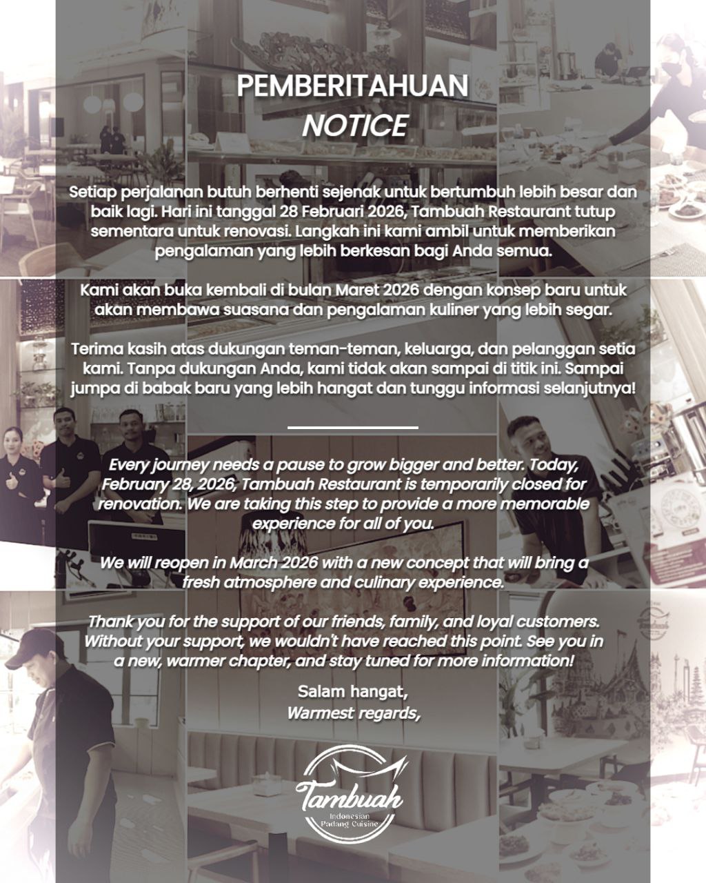 Committed to introducing Padang specialties from Indonesia that provide a dining experience with a unique feel. Being a restaurant that can be relied upon as a place for a nostalgic and unforgettable dining experience, not only from food & beverages, but the overall feel of the room is different from other Padang restaurants that have been present.